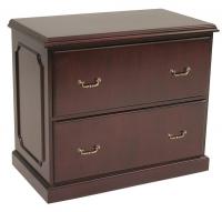 File Cabinet, Lateral, Prestige Series, File Size Letter/Legal, Number of Drawers 2, Overall Width 36 In., Overall Height 29 In., Overall Depth 24 In., Color Mahogany, Material Wood Veneer with Solid Wood Trim, Handle Brass Colored Metal Traditional Bail Pull Style, Standards Meets or Exceeds ANSI/BIFMA, Includes Lock with 2 Keys, Filing Bars